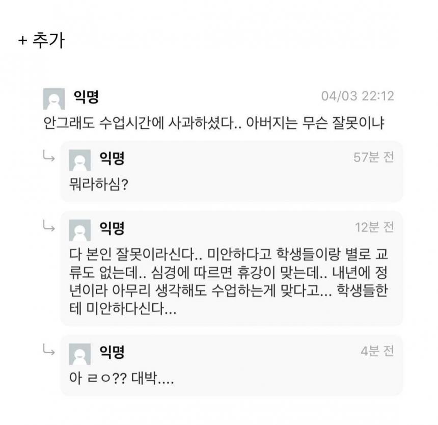 이에 "뭐라고 하셨냐"라는 다른 네티즌의 질문에 "다 본인 잘다 본인 잘못이라고 하신다. 미안하다고 학생들이랑 별로 교류도 없는데, 심경에 따르면 휴강이 맞는데, 내년에 정년이라 아무리 생각해도 수업하는게 맞다고 학생들한테 미안하다신다."며 당시 상황을 전했습니다.