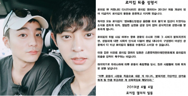 가수 로이킴의 팬들이 퇴출성명서를 발표했습니다. 디시인사이드 로이킴 갤러리에서는 "2012년 처음 갤러리가 개설되어 지금까지 로이킴의 활동을 응원하고 지지했다. 하지만 로이킴의 음란물 유포 혐의로 입건되었다는 소식을 듣고 참담함을 감출길이 없어 공식적으로 성명서를 발표 하게 되었다 고 말했습니다.