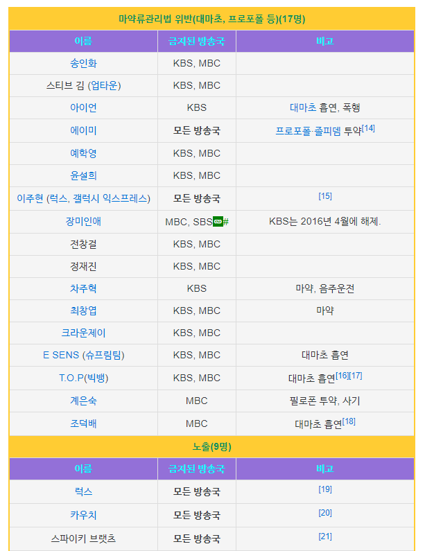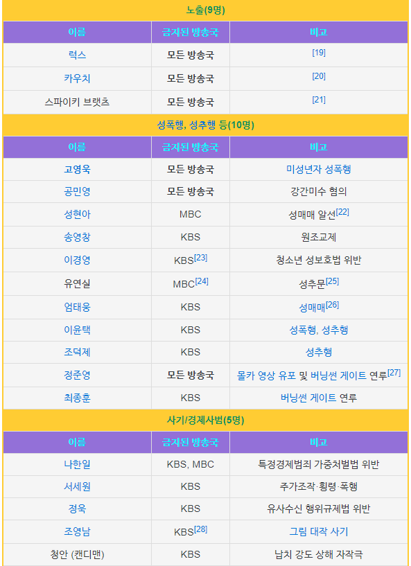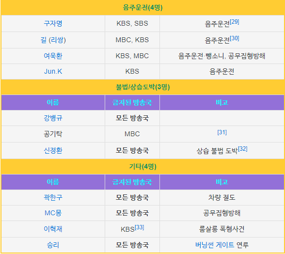하지만 모든방송사에서 출연금지가 아니기 때문에 이들은 KBS를 제외한 타 방송국과 종편에 출연할수는 있습니다. 출연금지는 본인의 진정성 있는 반성의 모습과 대중의 반응으로 인해서 해제가 될수있지만 이는 심사를 거쳐서 해제가 진행됩니다.